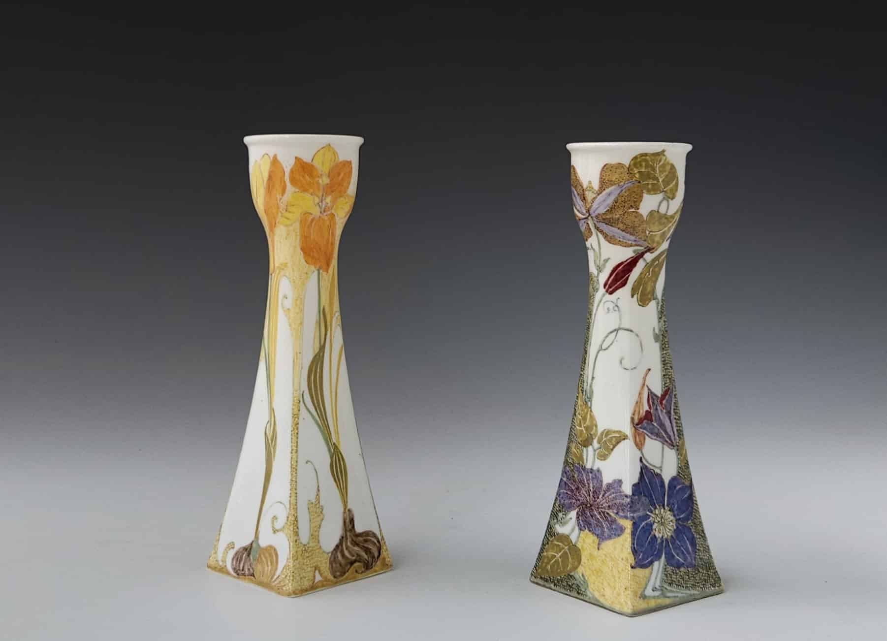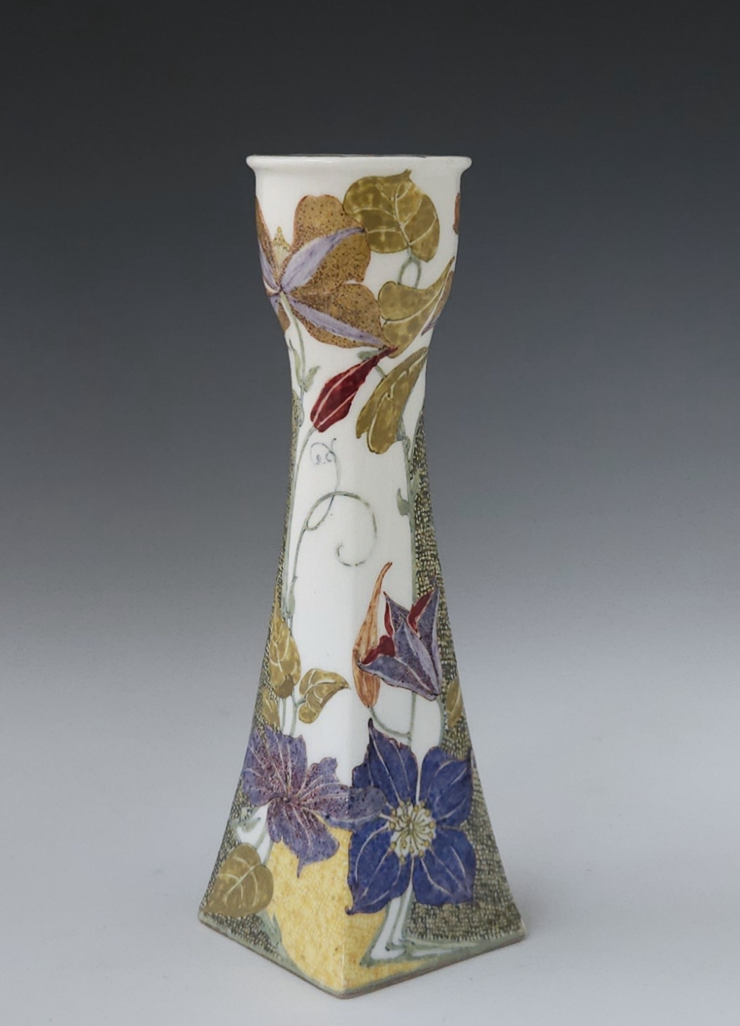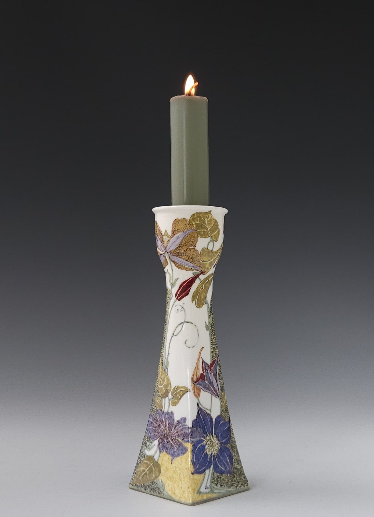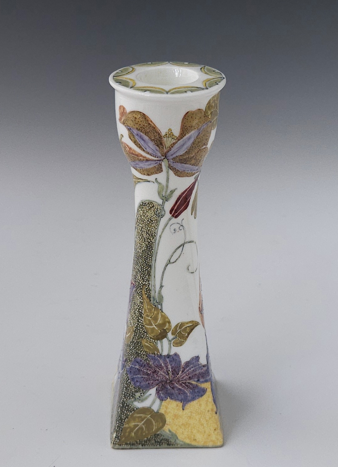 A Rozenburg De Haag eggshell porcelain candlestick painted with flowering clematis. The decoration is by Hartgring and the candlestick was painted together with De Weij in September 1902. Marked with the factory stamp, the year code, painter’s monogram and in relief the model number 212, work order number 1036. Height 16 cm.