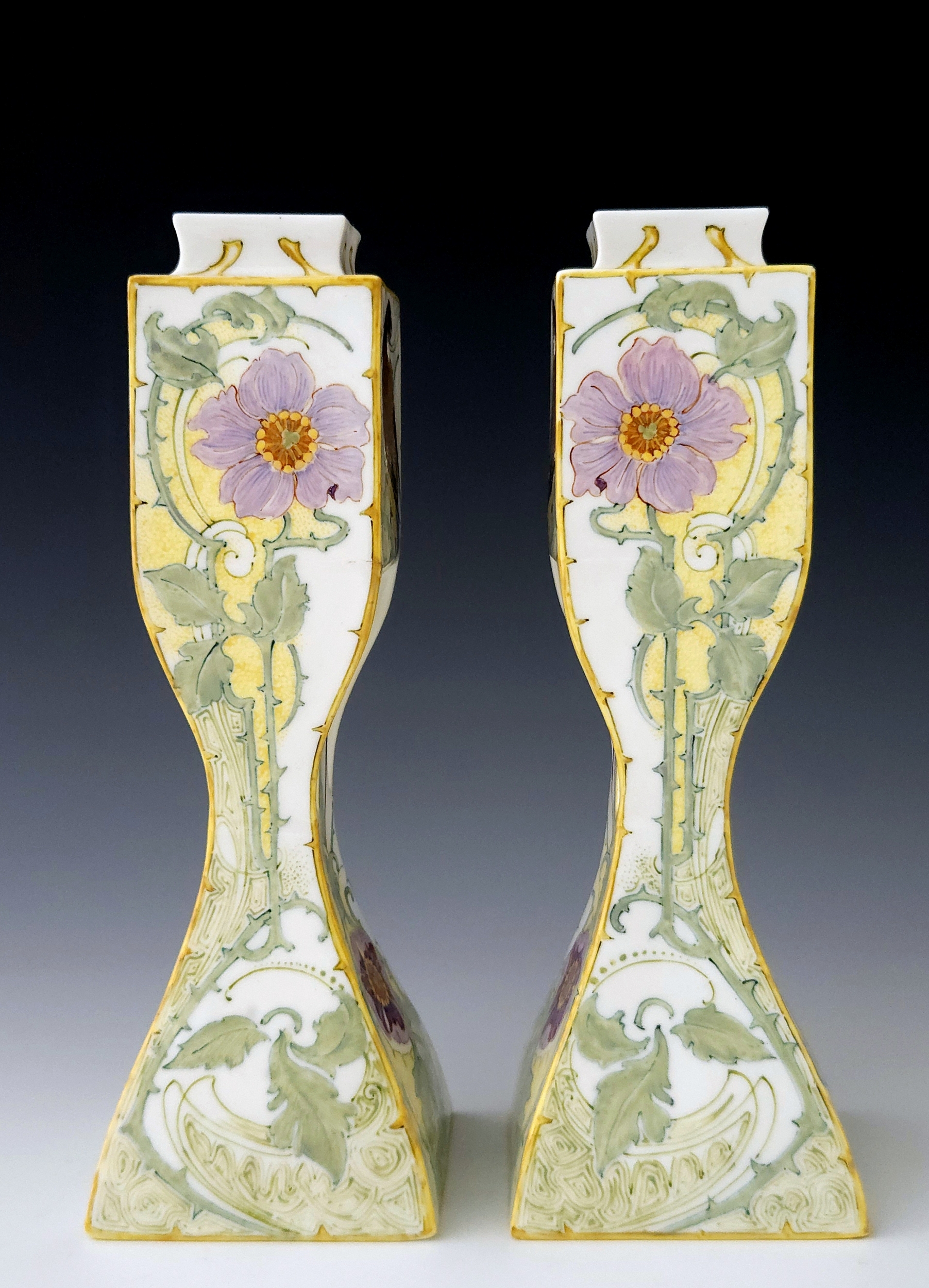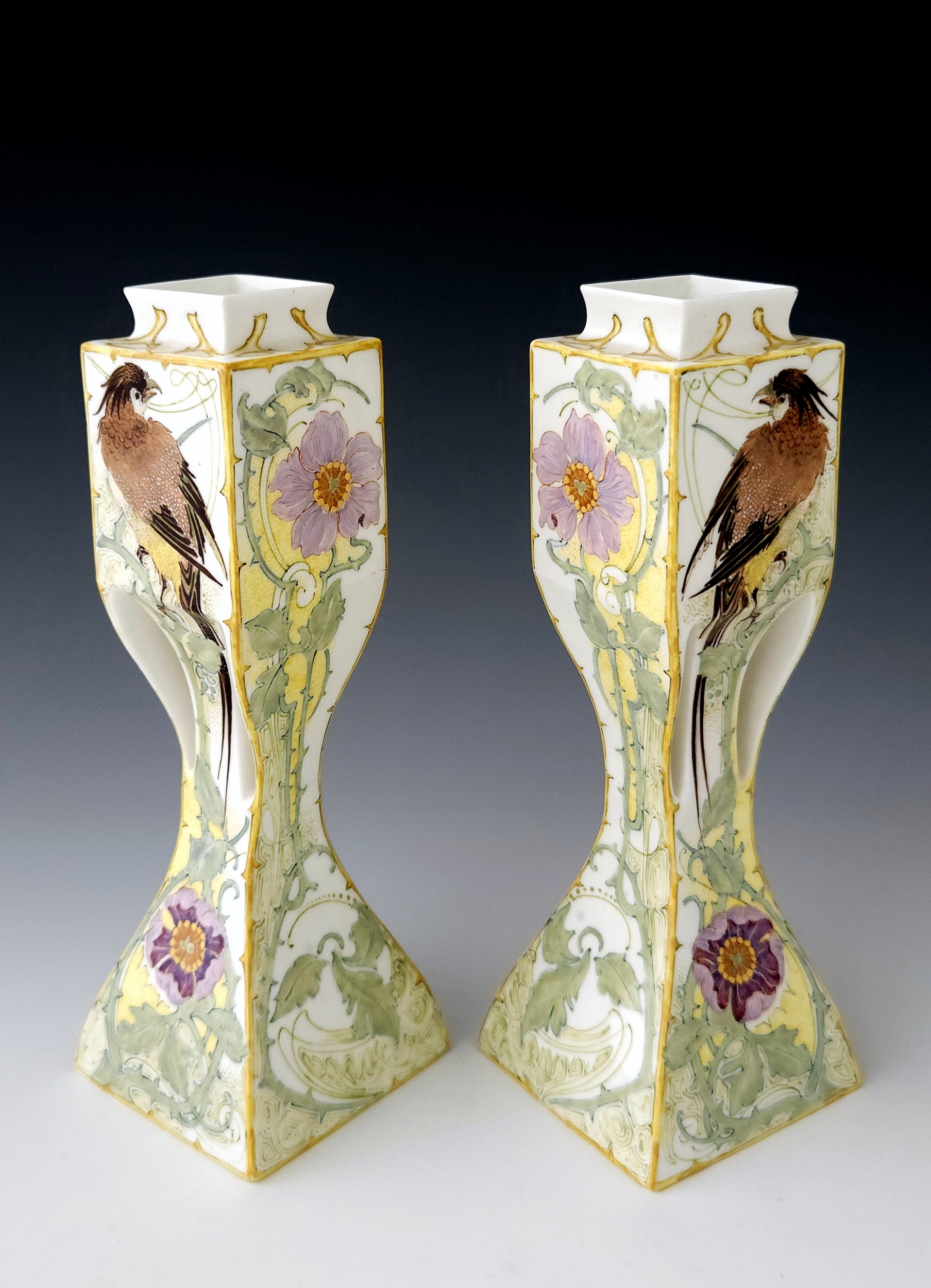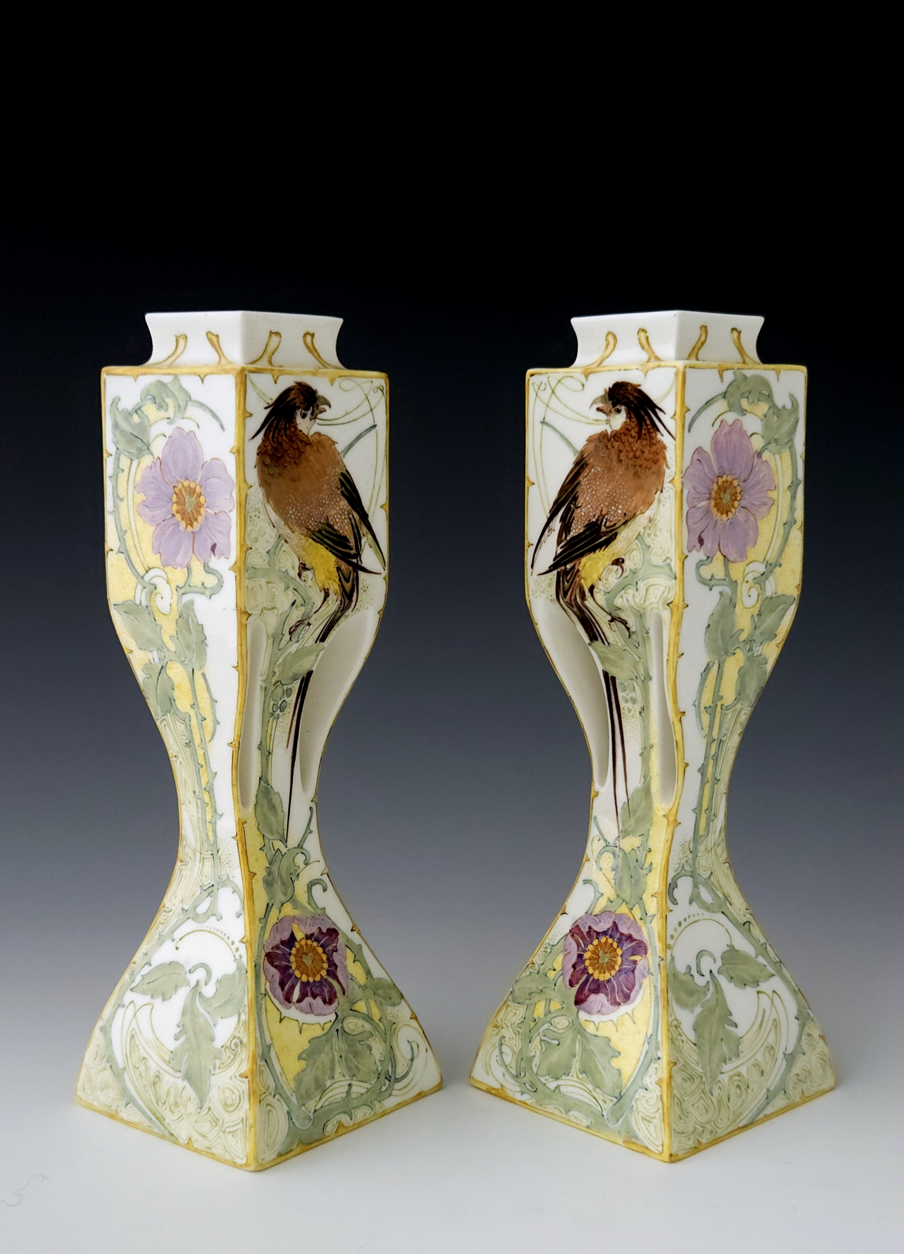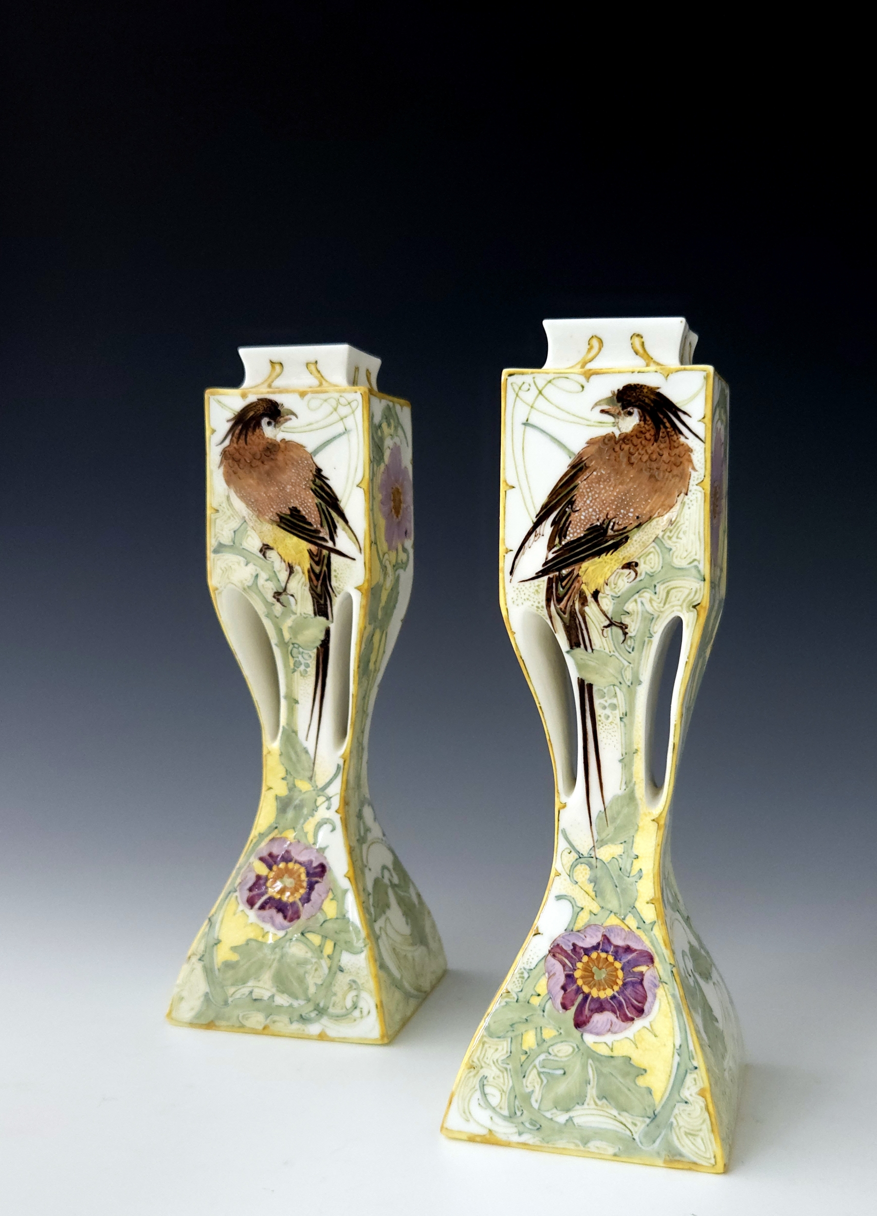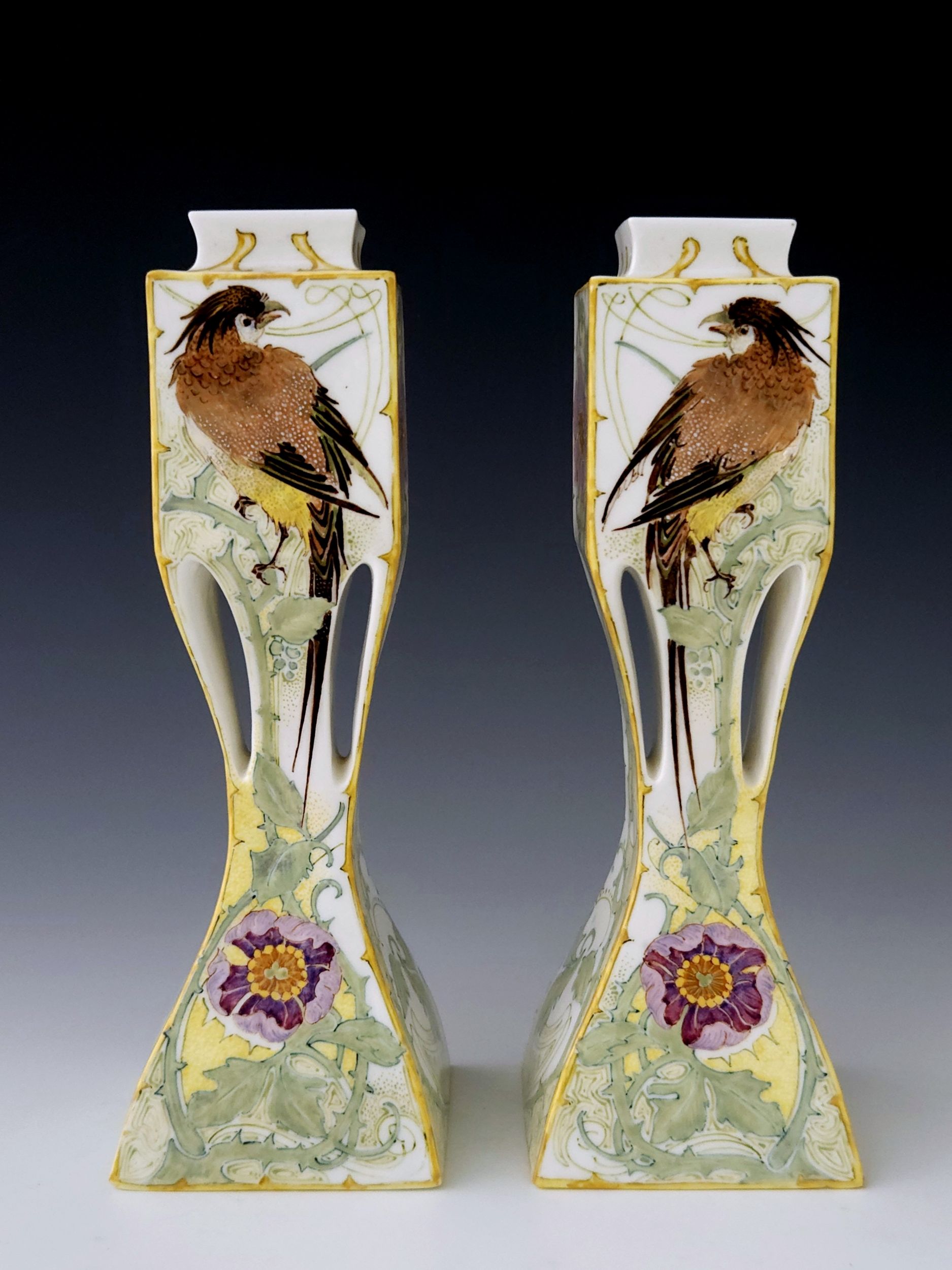 A rare pair of Rozenburg Den Haag eggshell porcelain vases with stylized handles by W.P. Hartgring, 1905. Both vases are painted with two birds amidst flowering branches in shades of green, yellow, brown, and purple. Both vases are 20.2 cm high, marked with work order number 440, 1905 year mark, and the painter’s monogram of W.P. Hartgring. The vases were painted by both Hartgring and C.W. J. ‘t Hart.