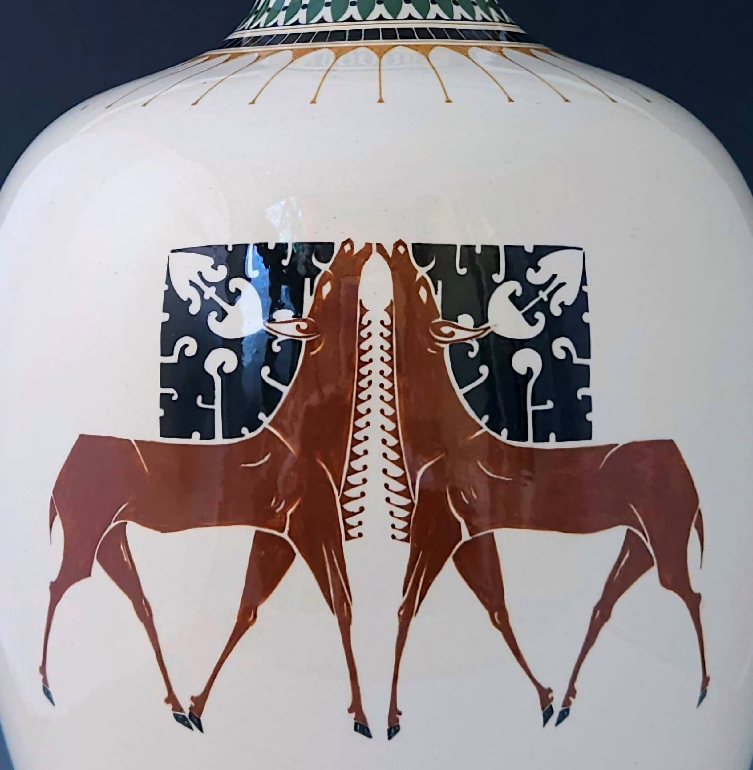 Een grote en zeldzame aardewerk vaas met een decor van twee burlende herten in bruin met gestileerde geweien in zwart, de hals beschilderd met geometrische banden in oker groen en zwart. Hoog 38 cm, gemerkt “Amphora Holland ontw. C.J. vd. Hoef. 249-1 VA” ingekrast modelnummer 249